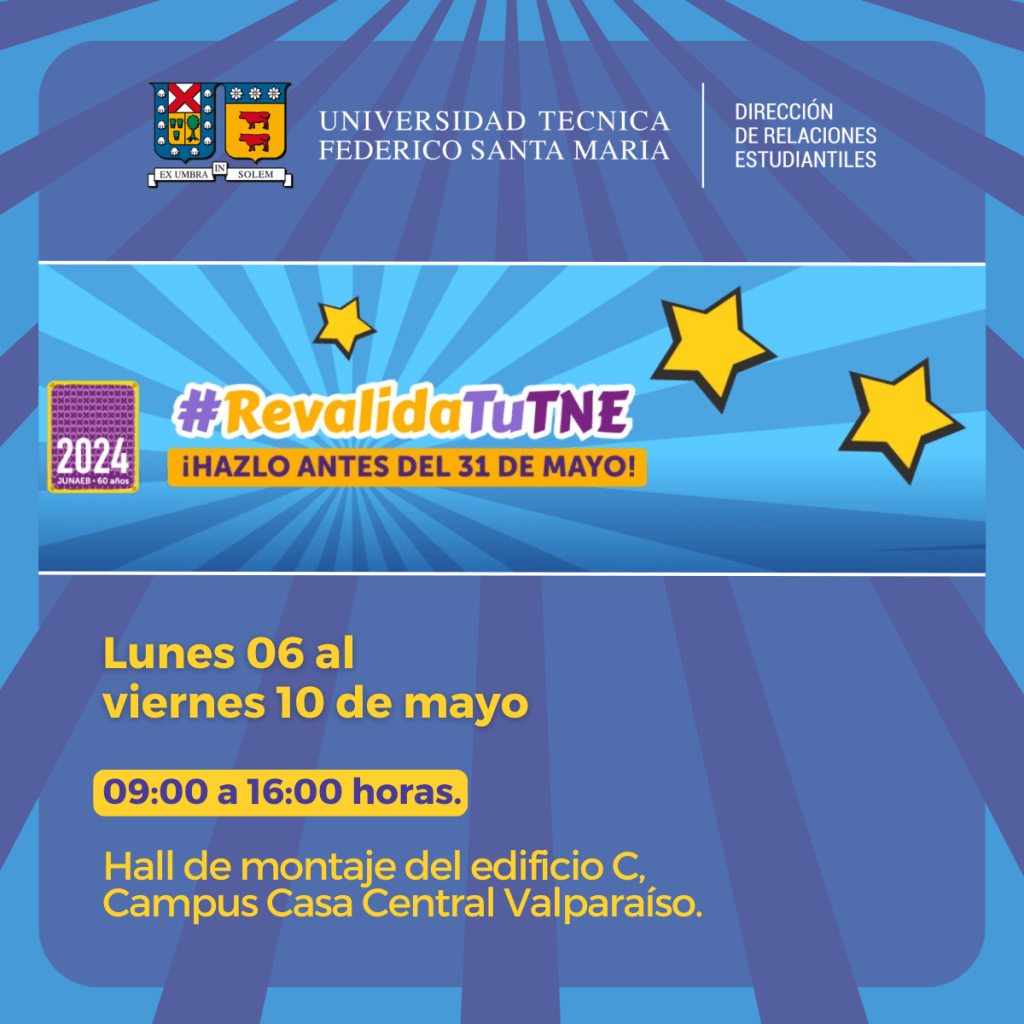 La Dirección de Relaciones Estudiantiles informa que la Junta Nacional de Auxilio Escolar y Becas (JUNAEB) continuará con el operativo de revalidación (pegado de sello) de la Tarjeta Nacional Estudiantil (TNE) 2024.